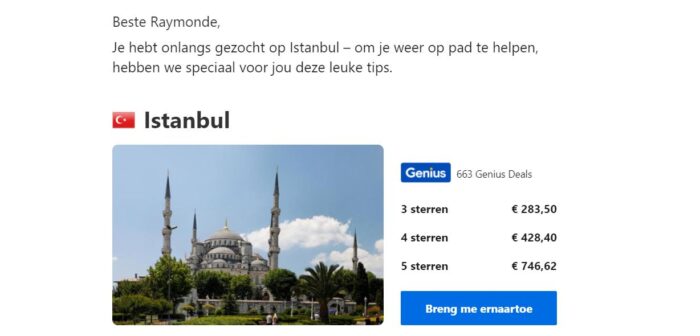 Een meest gebruikte vorm van personalisatie in een email, is jouw naam in de aanhef. Je ziet ook vaak dat interesses in de tekst verwerkt worden, zoals je kunt zien in de onderstaande afbeelding. Een tijdje terug keek ik op Booking.com naar aanbiedingen in Istanbul, om een paar dagen of weken later, aanbiedingen te ontvangen op basis van dat bezoek aan de website. Dit is een goed voorbeeld van dynamische content. Ik Aanbiedingen in mijn inbox op basis van eerder gedane aankopen van bijvoorbeeld bol.com, is ook dynamische content.