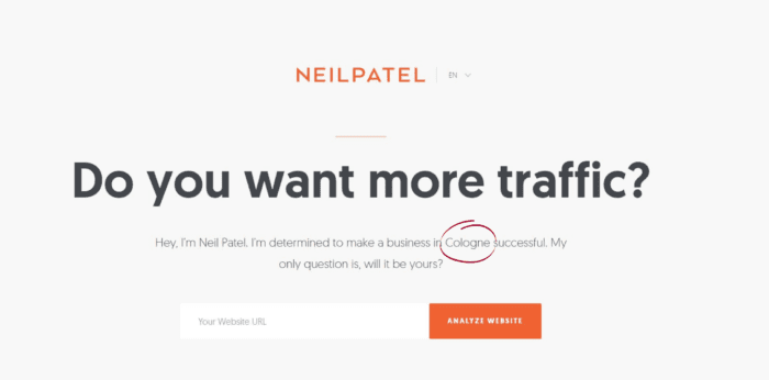Het komt nog weleens voor dat wanneer je een website voor een tweede keer bezoekt, je begroet met een tekst zoals: welkom terug! Dat is dynamische content. Een ander voorbeeld is de website hieronder van Neil Patel. Deze kijkt naar de regio waarin bezoekers wonen. Ik woon (op het moment van schrijven) in Düsseldorf en als ik de website van uit mijn locatie bezoek, krijg ik het volgende te zien: