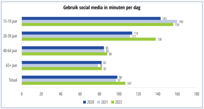 Newcom doet ieder jaar onderzoek naar het social media gedrag van Nederlanders. Dit onderzoek werd dit jaar voor de twaalfde keer gehouden onder meer dan zevenduizend deelnemers van 15 jaar en ouder en het laat zien dat met name de groep 20-39-jarigen, social media veel meer zijn gaan gebruiken dan in de voorgaande jaren. Waar we vorig jaar nog dagelijks 97 minuten spendeerden aan social media, is het nu 107 minuten per dag.