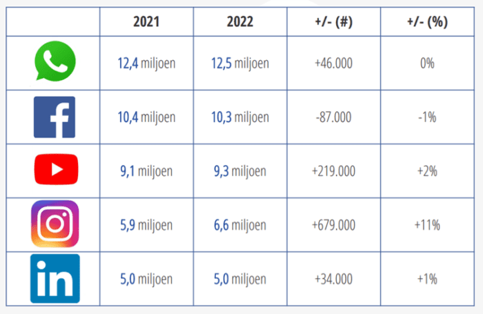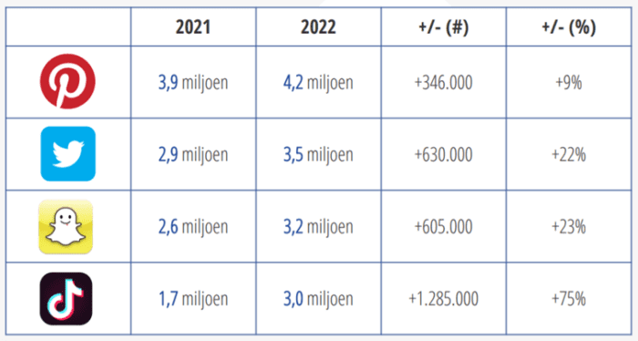 We gebruiken ook meer platformen dan voorheen. Het landelijk gemiddelde ligt nu op 4,2 social media kanalen per persoon, terwijl het vorig jaar nog 3,9 waren. In de overzichten hieronder, zie je de grootste social media kanalen die we in Nederland kennen. Hierin is te zien dat, met uitzondering van Facebook, er een groei is in het aantal gebruikers ten opzichte van het jaar daarvoor. Instagram, Pinterest, Twitter, Snapchat en TikTok groeiden het afgelopen jaar flink met respectievelijk 11, 9, 22, 23 en maar liefst 75 procent.