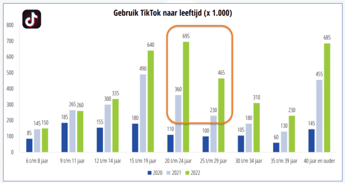 Het heeft zijn voordelen om als ondernemer actief te zijn op meer dan één social media platformen. Ieder kanaal heeft zo zijn eigen sterktes en doelgroep. Het hardst groeiende platform bijvoorbeeld, TikTok, wordt zoals de afbeelding hieronder laat zien veel gebruikt door twintigers, maar erg populair bij dertigers is het (nog) niet.